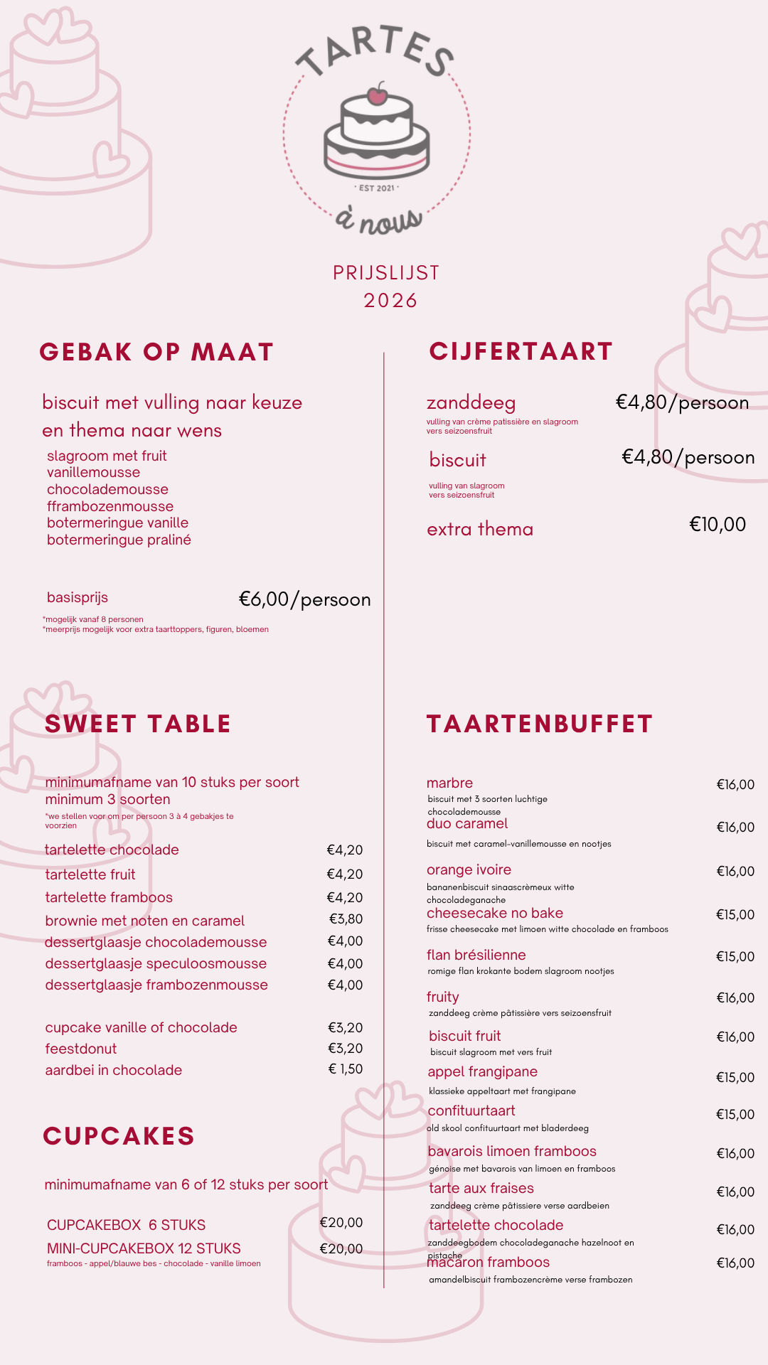 Hou er rekening mee om minstens 7 dagen vooraf te bestellen voor taart uit het vaste assortiment.